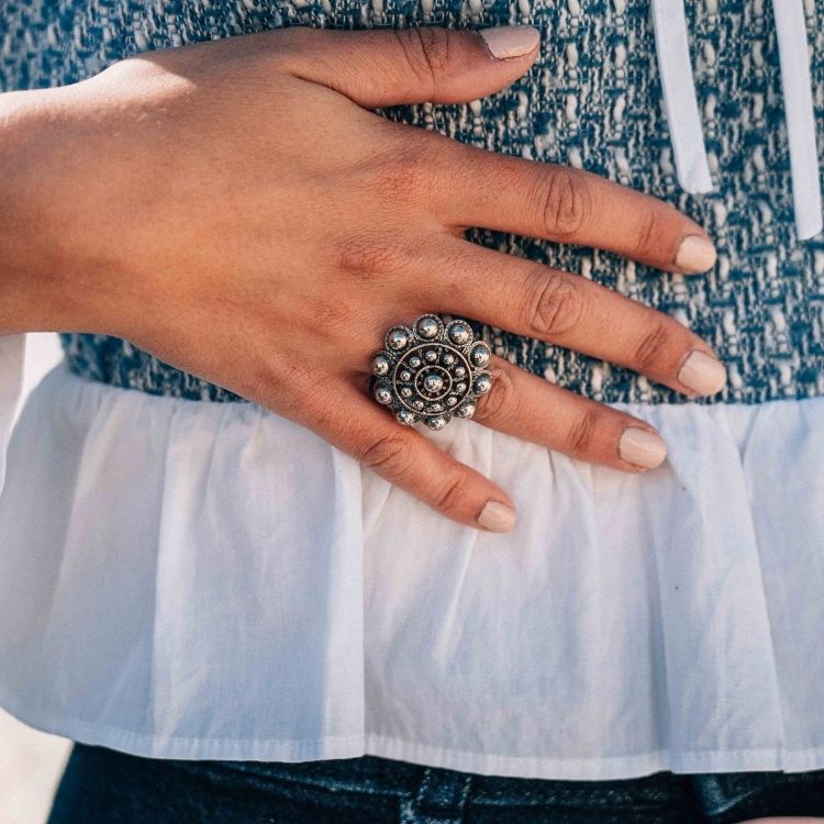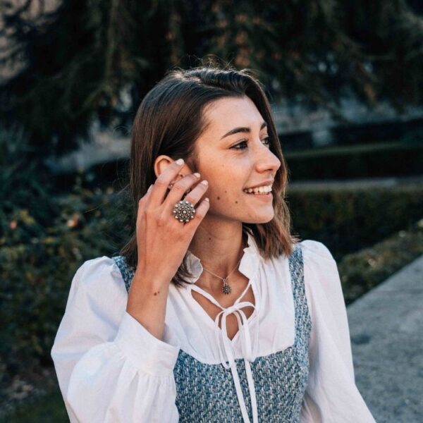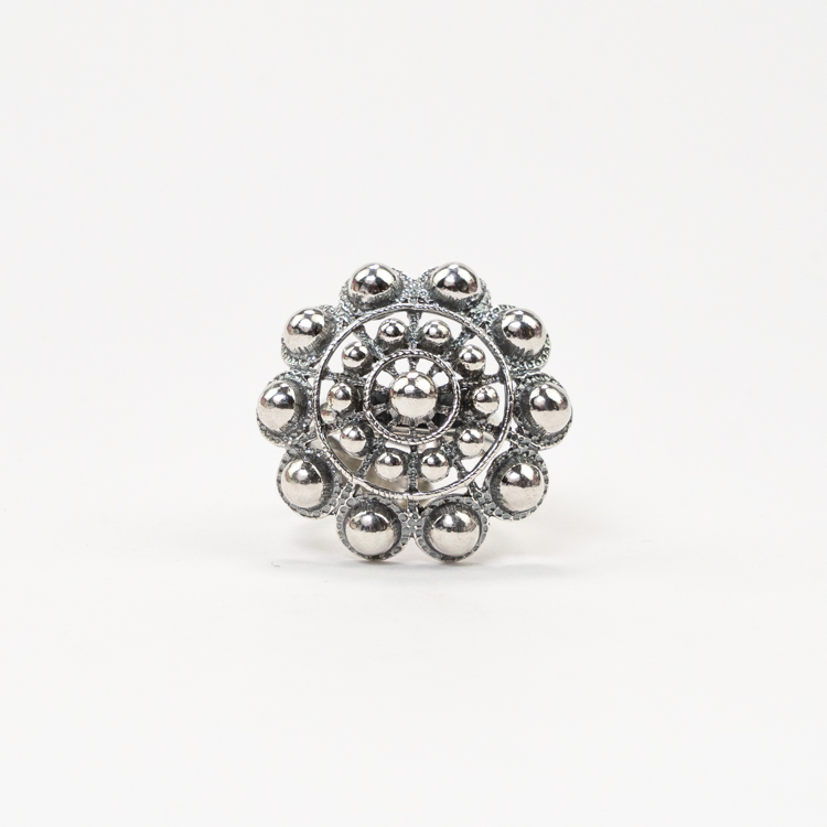 Botón charro en plata de ley con anillo abierto, lo que permite intercambiarlo de dedo.