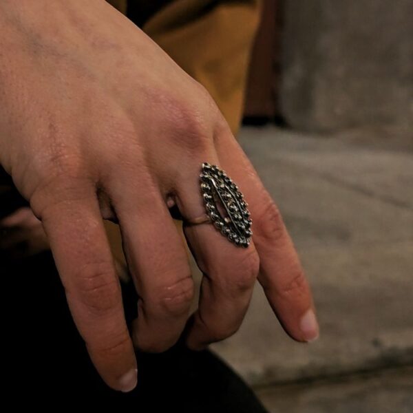 Con un largo de 31 mm y un ancho de 14 mm, este anillo captura la atención por su detallado diseño. Formado por 5 bolas centrales rodeadas por 20 en el exterior, cada elemento ha sido pensado para evocar la delicadeza y precisión de la filigrana charra, convirtiéndolo en una pieza excepcional y de gran belleza.