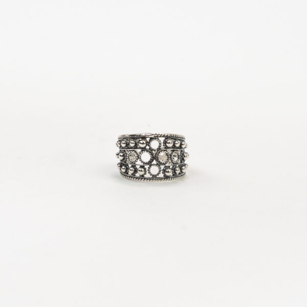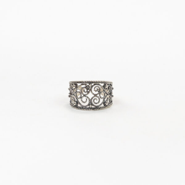 Anillo con aspecto de encaje en el que la filigrana charra le da valor estético a los espacios ocupados como a los vacíos de la joya, haciendo de ésta una pieza muy versátil ya que puedes lucirlo cada día en un dedo diferente y muy cómodo de llevar.