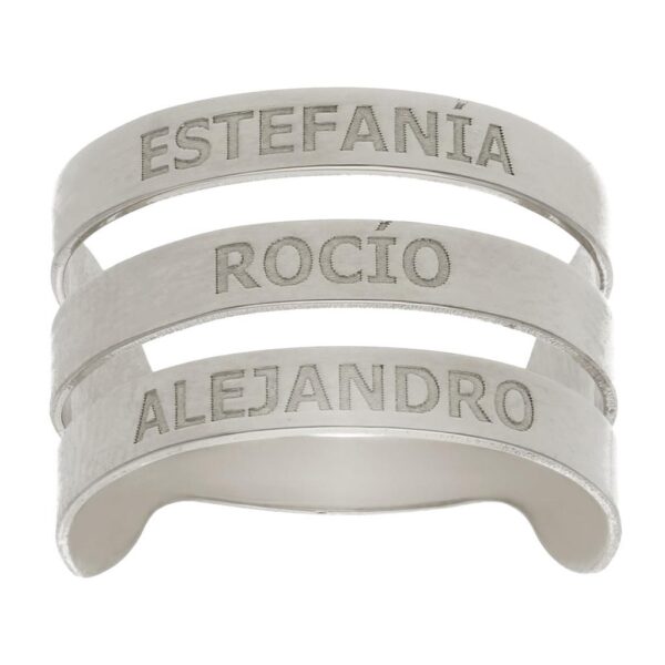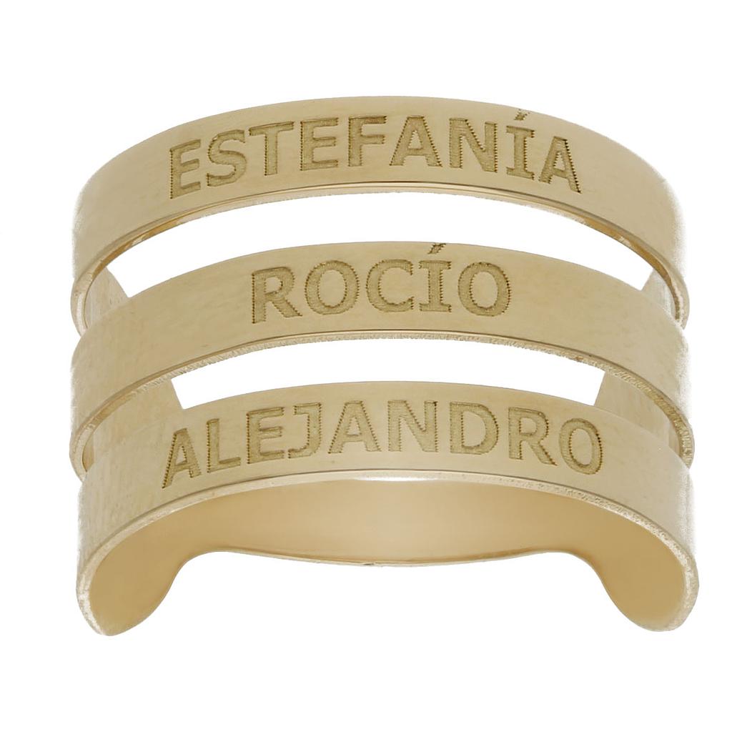 Bonito anillo personalizable con tres nombres. Es una joya que nunca pasa de moda, podrás poner tu nombre, el de tu madre o el de tu hija. Disponible en oro, oro blanco y plata de Ley.