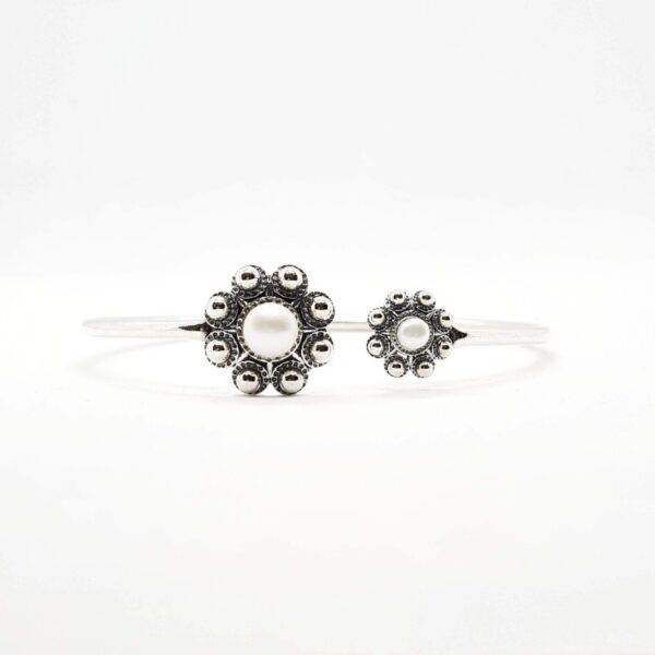 Brazalete de botones charros, uno más grande que otro, en plata de ley con perla blanca en el centro de cada botón.