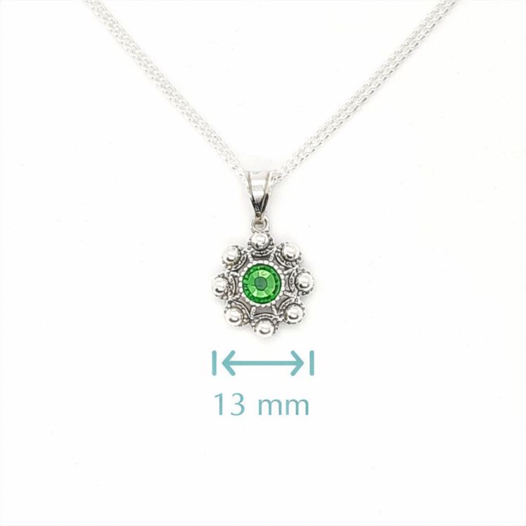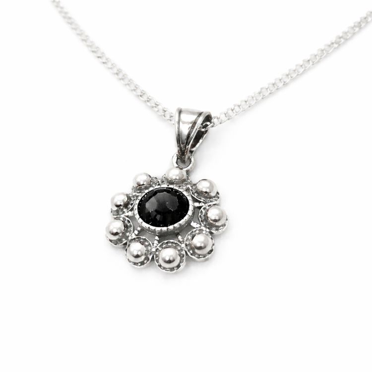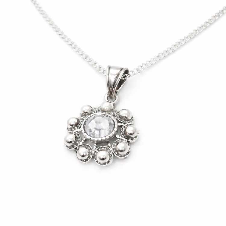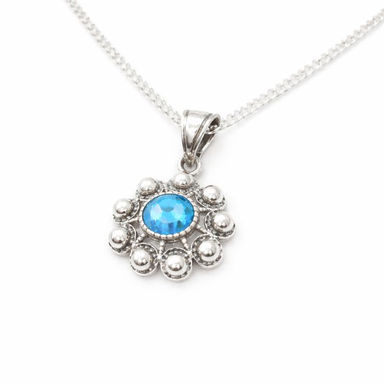El colgante está elaborado en plata de ley 925 y presenta un diseño de botón charro rodeado por ocho bolas que custodian la pieza central: un cristal de color engarzado que aporta luz, contraste y personalidad.