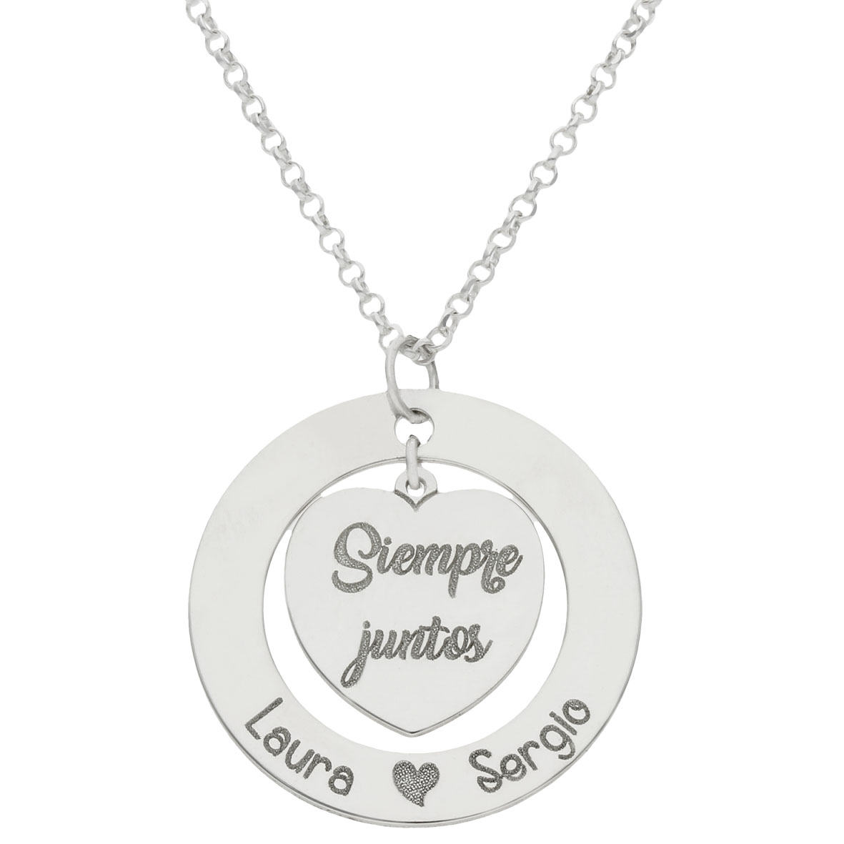 Gargantilla circular con corazón en el centro personalizable con nombres, una fecha o una frase. Medidas del colgante: 25mm.
