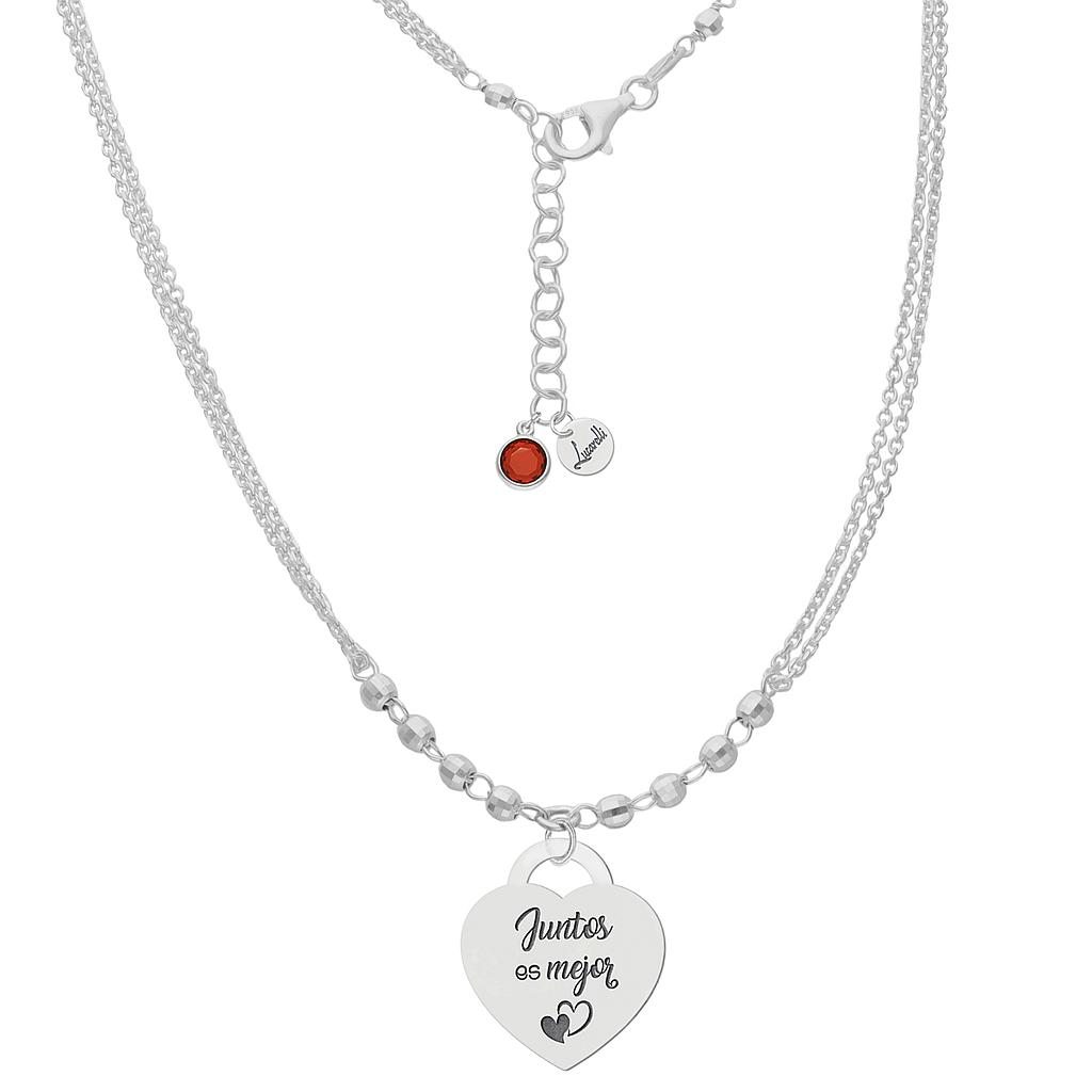El colgante con forma de corazón, de dimensiones 20x22mm, lleva grabada la frase «JUNTOS ES MEJOR». Este mensaje emotivo y sincero convierte la gargantilla en una joya única que transmite el valor de la unión y la conexión emocional. Además, su terminación en brillo realza la belleza del diseño, haciéndola destacar en cualquier ocasión.
