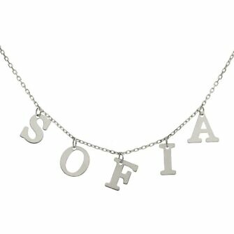 Gargantilla con letras colgando formando nombre. Alto de letra: 8mm. Terminación en brillo.