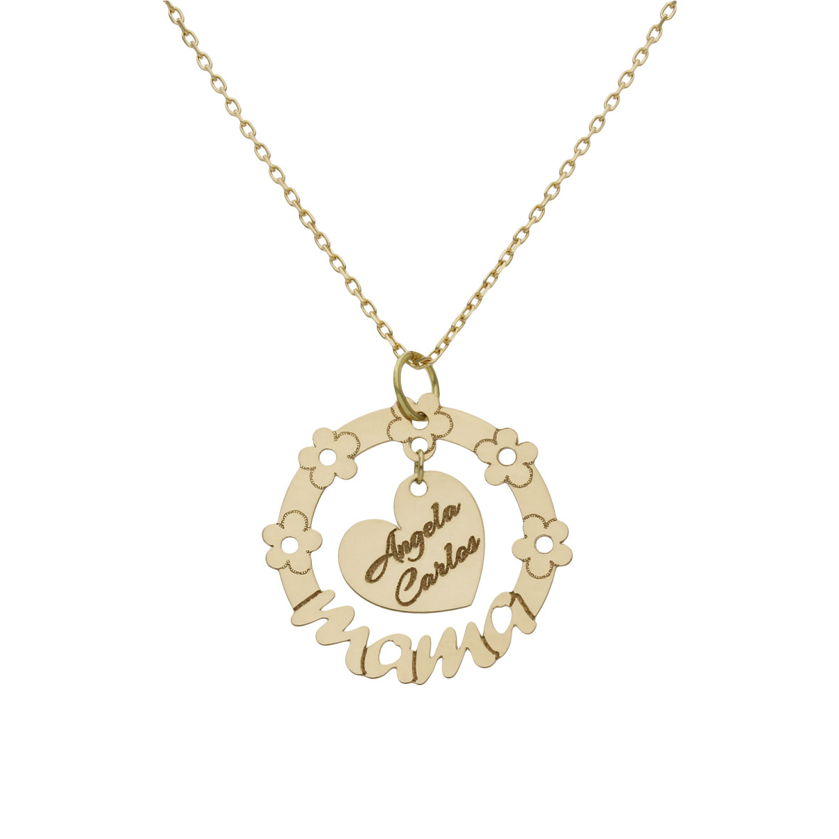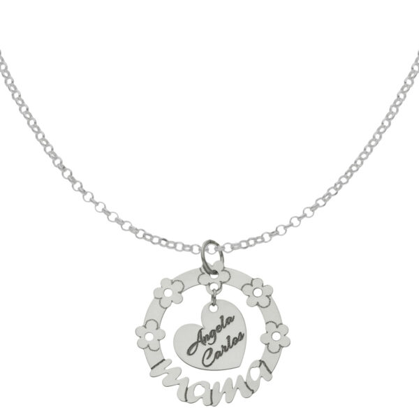 Gargantilla circular con la palabra mama y flores y en el centro un corazón personalizable con los nombres que desees. Diámetro del colgante: 22mm. Medidas del corazón: 11x11mm.