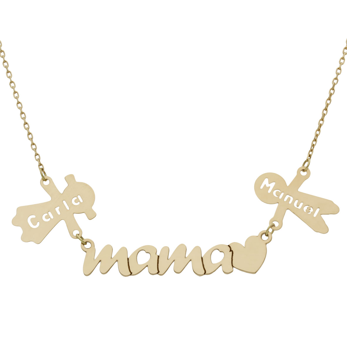 Fabricada en oro con acabado brillante, esta gargantilla destaca por su diseño elegante y emocional. El colgante con la palabra mamá tiene unas medidas de 7 mm de alto y 34 mm de ancho, aportando presencia y equilibrio. Además, los colgantes de los niños tienen una altura de 15 mm, creando una composición armoniosa y llena de ternura.