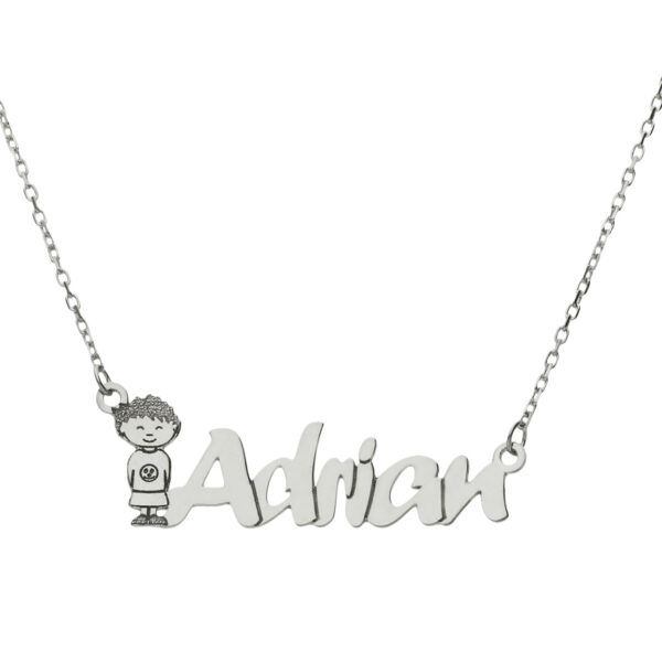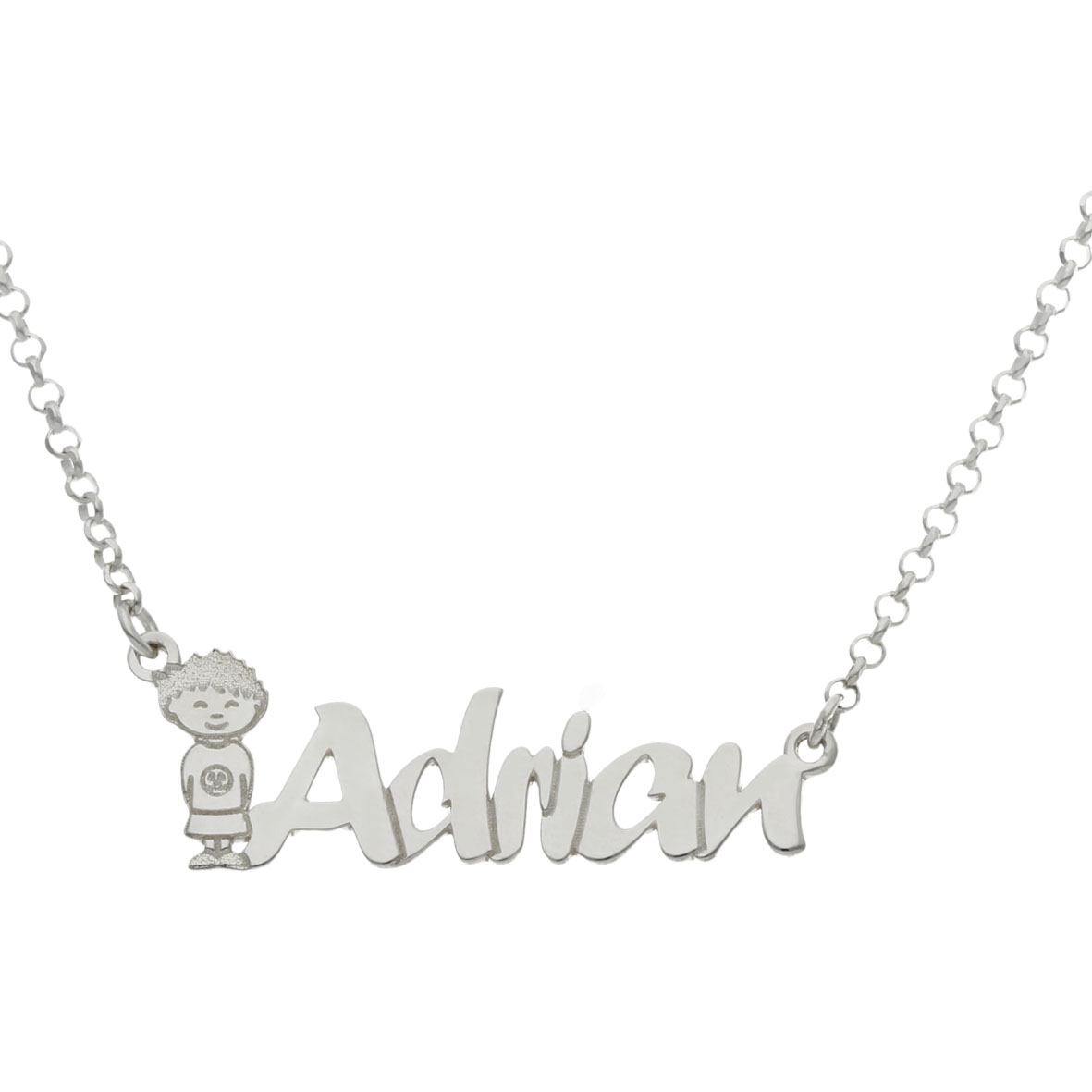 Bonito colgante con un niño junto al nombre que desees. Es perfecto para poner el nombre de tu hijo. Lo tenemos en tres materiales oro, oro blanco y plata.