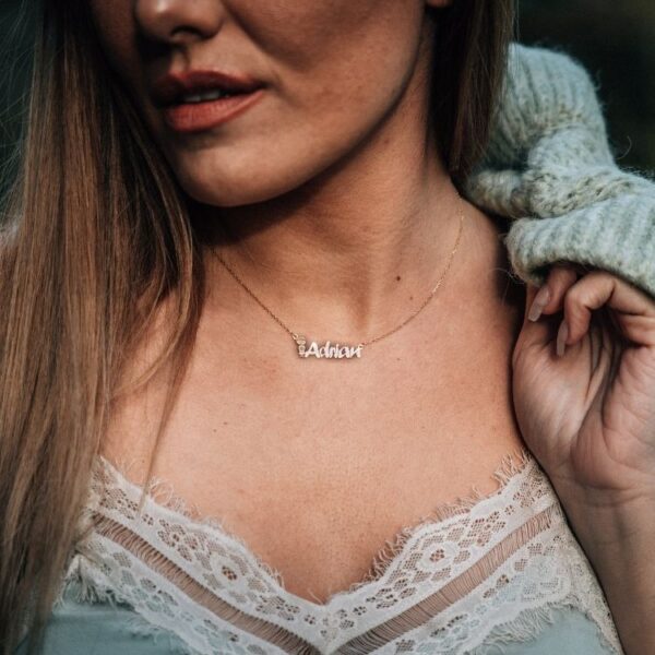- Oro y oro blanco de 18 Kl: Incluye cadena forzada de 0.50mm de grosor con opción de colocar la cadena en dos posiciones de largos: 40 cm y 45cm. Terminación en mate y brillo. Medidas alto del nombre: 10mm.