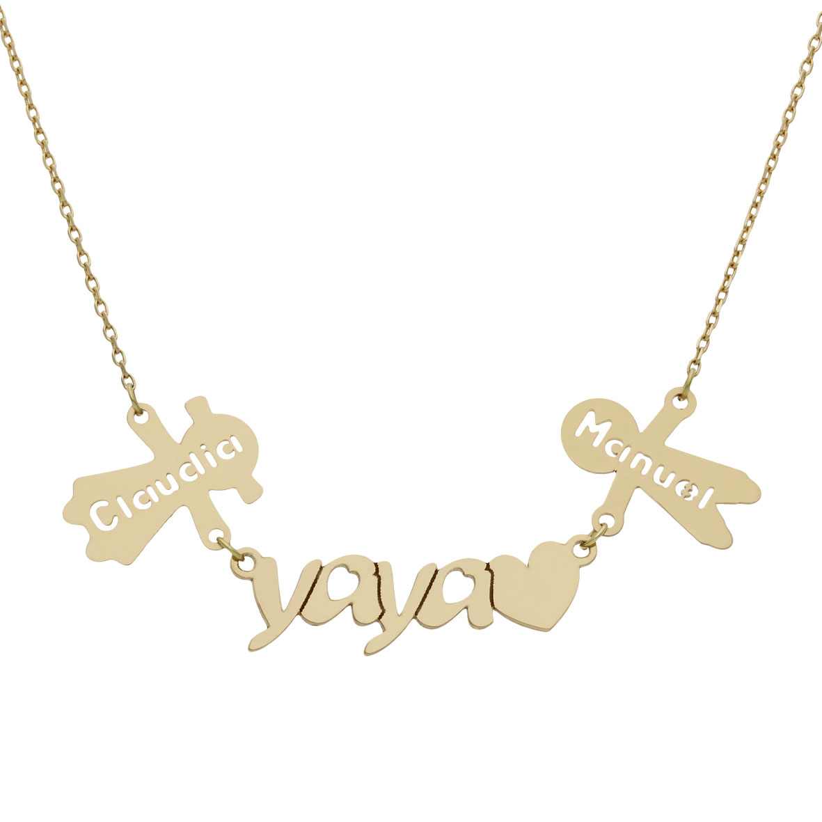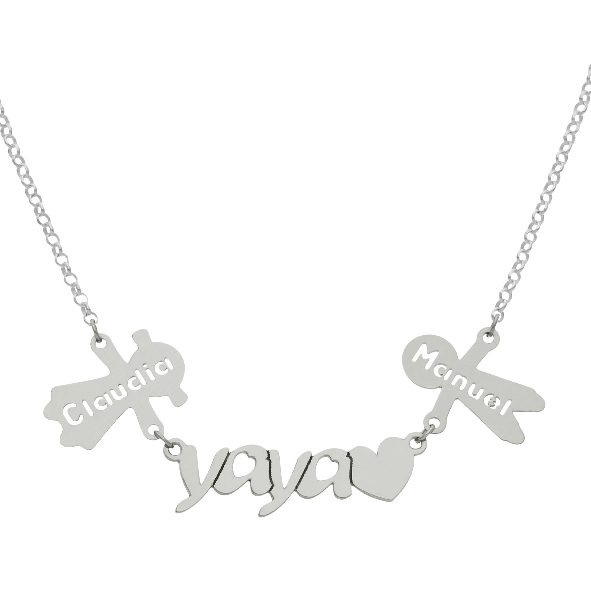 Gargantilla con la palabra yaya unida a un corazón y con muñecos en forma de niños personalizables pudiendo añadir hasta cuatro nombres. Alto de colgante yaya: 7mm. Ancho de colgante yaya: 27mm. Alto colgante niños: 15mm.
