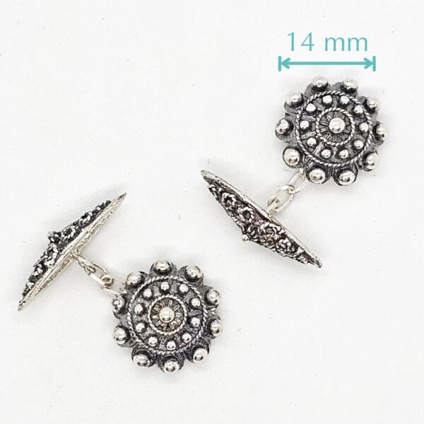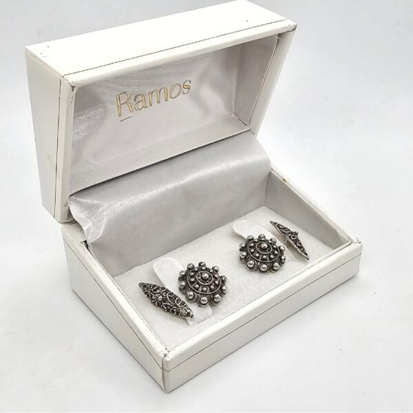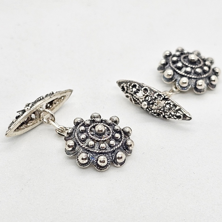 Gemelos de Botón charro con «ballestilla» de filigrana charra unidos por cadena todo en plata de ley