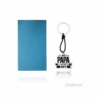 Llavero de acero grabado a láser con la inscripción “mi papá es un rey” dentro del diseño desenfadado.