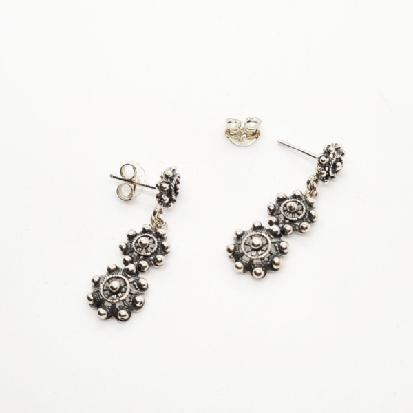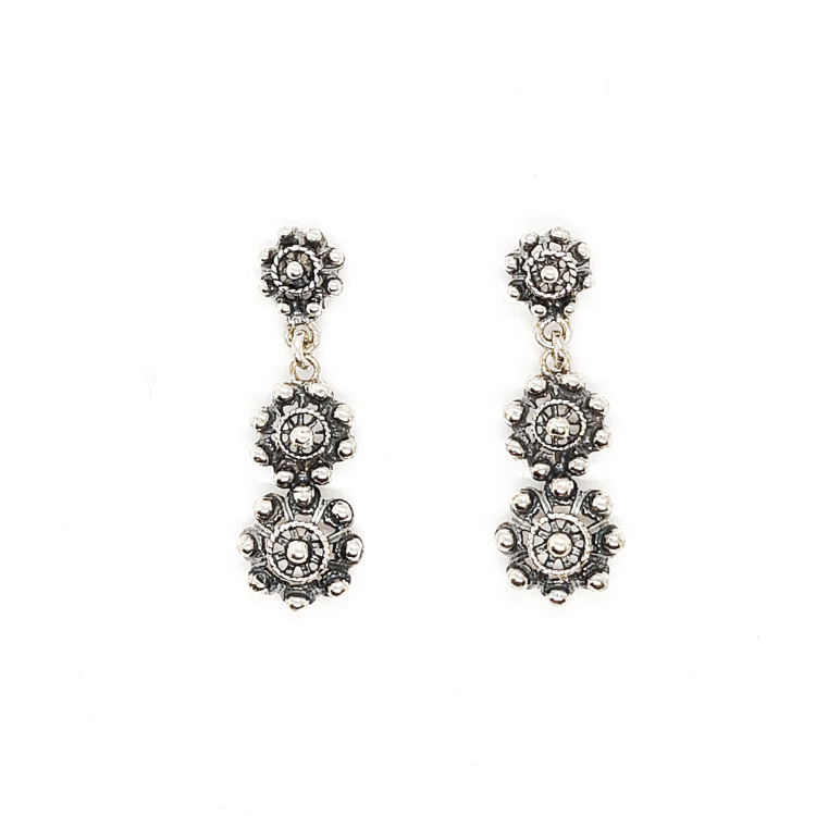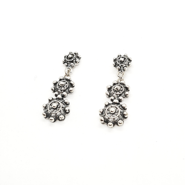 Pendientes con tres botones charros en diferentes tamaños en plata de ley oxidada.