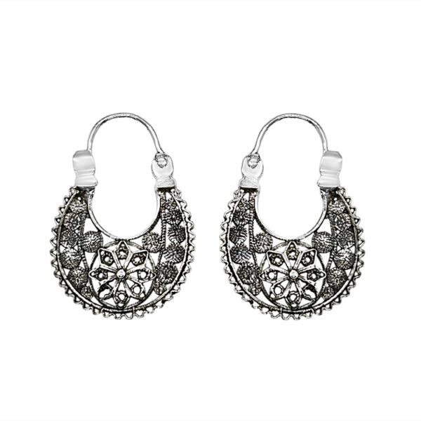 Pendientes, aros de filigrana en plata de ley oxidada con aspecto antiguo.