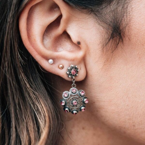 Unos pendientes de botón charro diferentes con un toque más fresco y moderno gracias a los cristales de colores engarzados en el propio botón.
