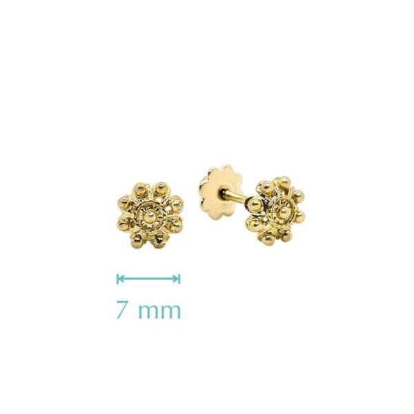 Los pendientes charros de oro para niña son una joya que combina tradición y elegancia. Fabricados en oro de 18 quilates, presentan el icónico botón charro de 7 mm de diámetro. Son ideales para niñas a partir de 8-9 años, perfectos para comuniones, o para chicas jóvenes que prefieren pendientes pequeños o de un tamaño discreto. El cierre de rosca asegura comodidad y seguridad, evitando que se claven en la piel, lo que los convierte en una opción ideal para el uso diario.