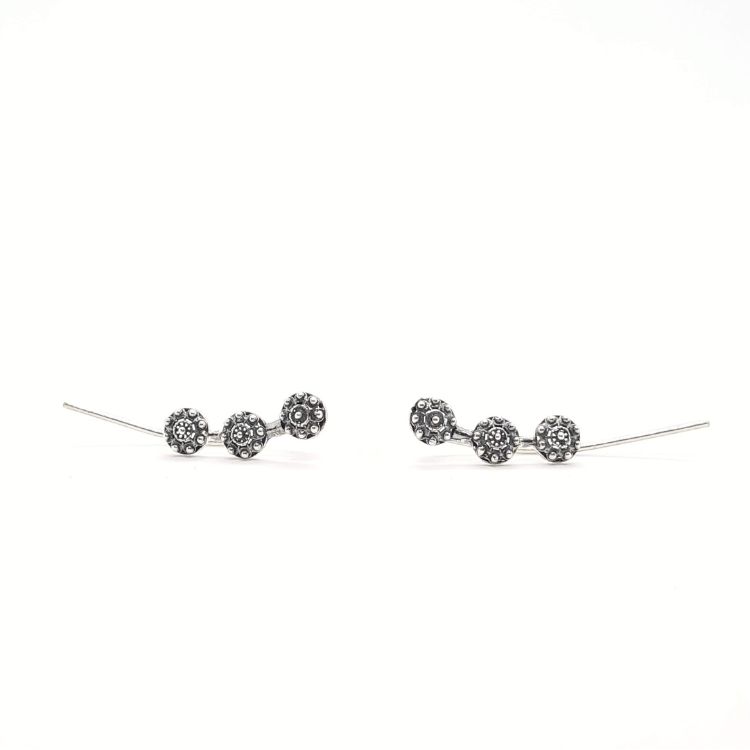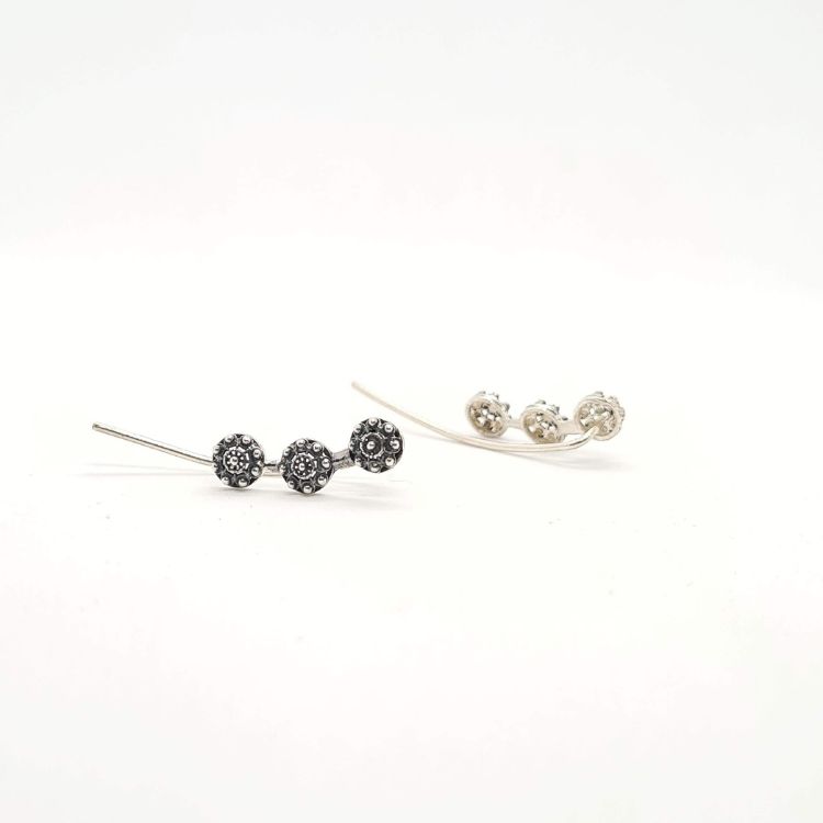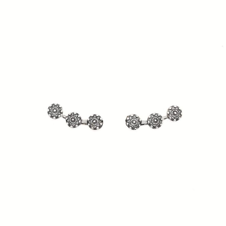 Pendientes trepadores charros con tres botones charros de 5 mm de diámetro cada uno en plata de ley oxidada.