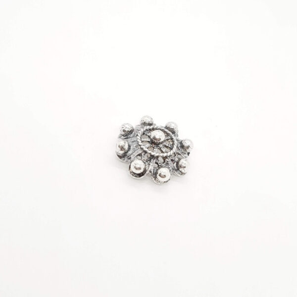 Pin en plata de ley oxidada de filigrana charra con forma de botón charro.