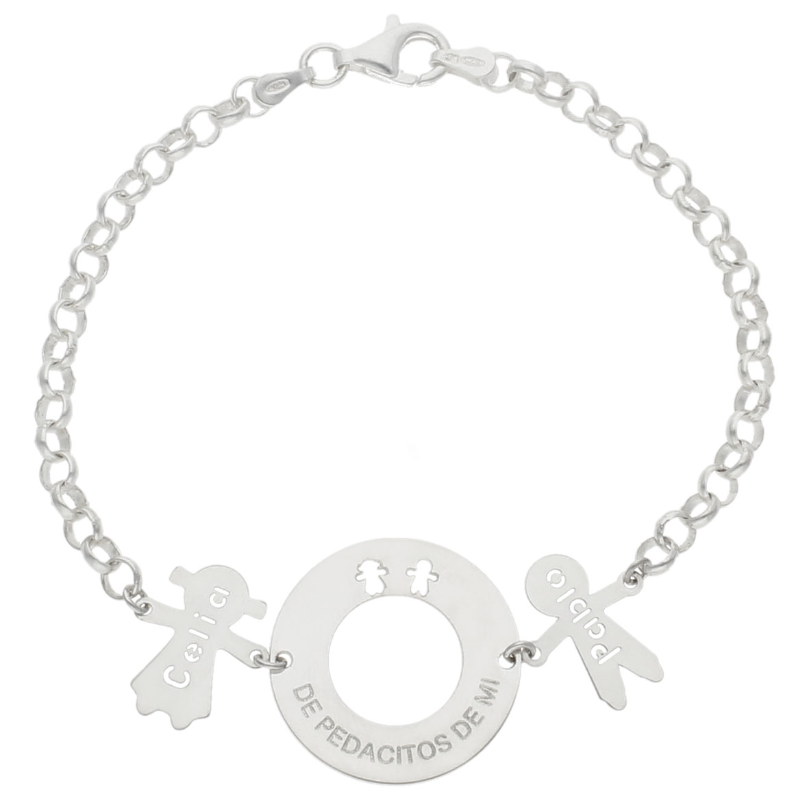 Pulsera «DE PEDACITOS DE MI» en Plata de Ley 925mm con motivo redondo con grabado + motivos niños y niñas con nombre personalizado. Terminación en brillo. Medidas de cada motivo: 14x15mm. Medidas del motivo circular: 22mm.