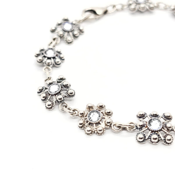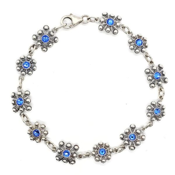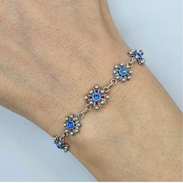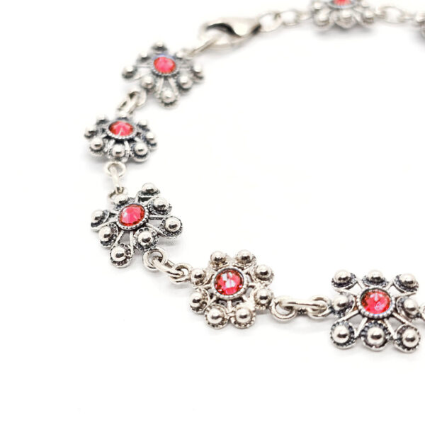Fabricada en plata de ley, esta pulsera incorpora 11 botones charros. Alternan entre diseños redondos y cuadrados de 8 mm. Los cristales añaden un toque de color y vida. Puedes elegir entre azul, blanco, fucsia, morado, negro, rojo, rosa, verde, y verde olivina. Esta variedad permite personalizar la pulsera a tu gusto.