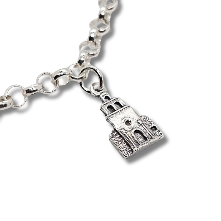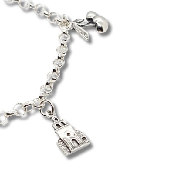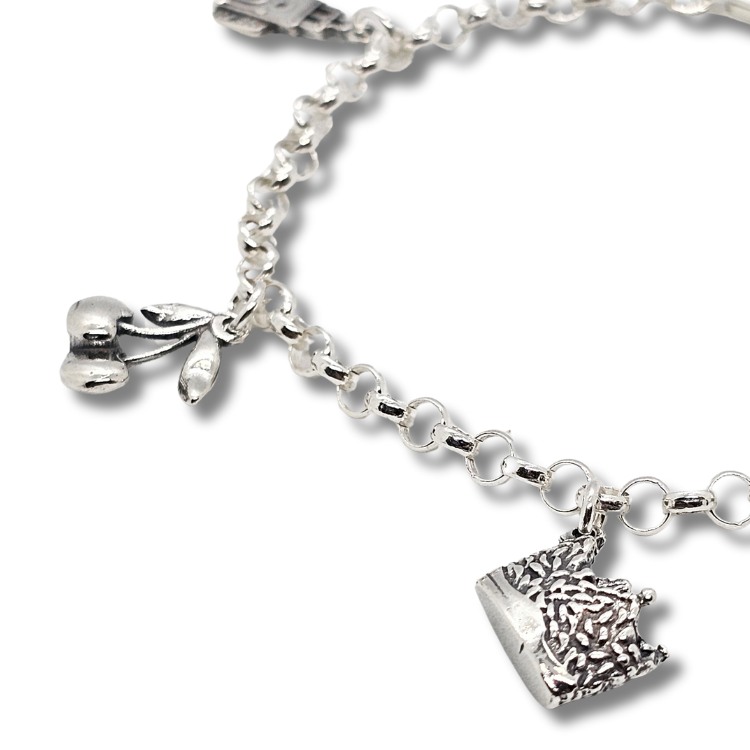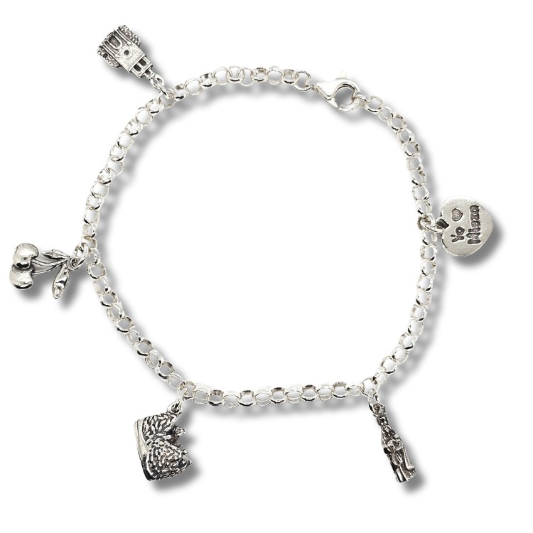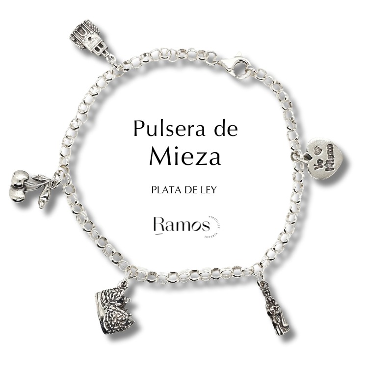 Elaborada en plata de ley, la pulsera presenta eslabones tipo rolo que permiten ajustar su longitud, adaptándose cómodamente a cada muñeca. Sin embargo, lo que realmente la distingue son sus cinco abalorios, cada uno representando un símbolo emblemático de Mieza: