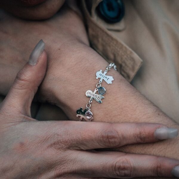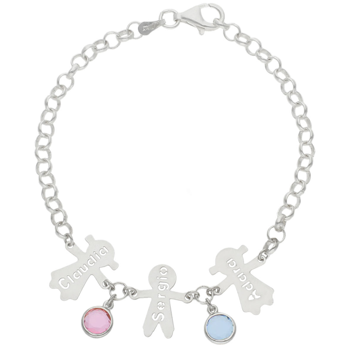 Preciosa pulsera en Plata de Ley con niños que podrás personalizar con el nombre en calado y también podrás elegir el color de la piedra que desees. Si te gustan las joyas personalizadas, esta pulsera es muy elegante y original. Es ideal para poner el nombre de tus hijos, nietos o sobrinos. Se pueden añadir hasta seis niños. Es perfecta para regalar por el Día de la Madre.