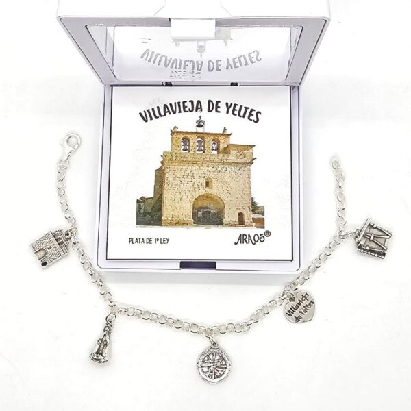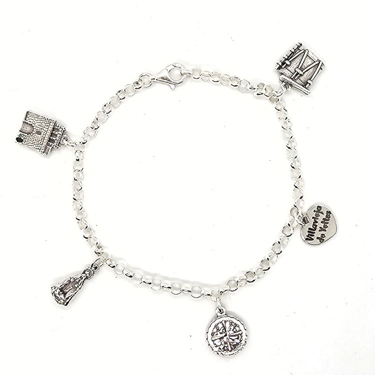 Elaborada con la más fina plata de ley, la pulsera se adorna con cinco abalorios que representan la esencia de Villavieja de Yeltes. Además, cada pieza narra una historia única de este lugar. Por ejemplo, el corazón grabado con el nombre del pueblo simboliza el fuerte vínculo de sus habitantes con su hogar.