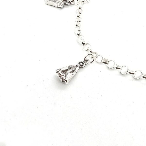 La elegante cadena tipo rolo sostiene cinco abalorios únicos, cada uno reflejando un símbolo icónico de Villavieja de Yeltes. Desde el grabado del corazón que lleva el nombre del pueblo hasta la representación de la Virgen de los Caballeros, la iglesia de San Pedro Ad Víncula, el escudo del pueblo y los tradicionales instrumentos charros (gaita y tamboril), esta pulsera es un puente hacia los recuerdos, la cultura y la identidad que define a Villavieja.