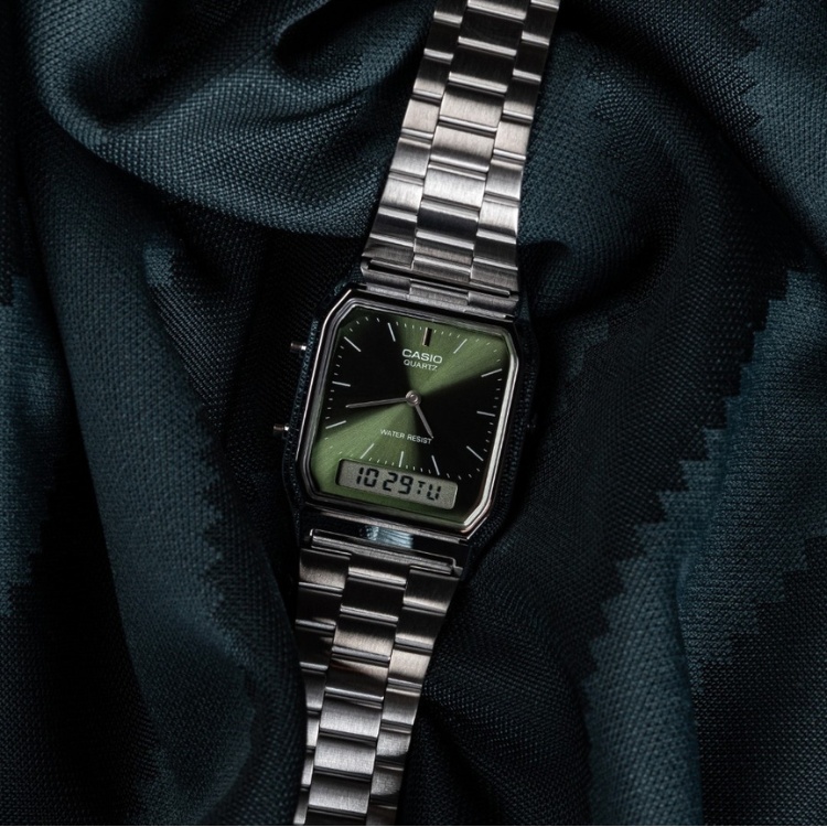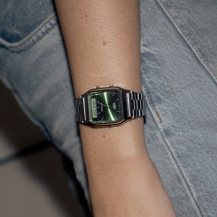Hay relojes que simplemente dan la hora… y luego está el Casio AQ-230EGG-3A. Su diseño cuadrado vintage se mezcla con una elegante esfera verde que aporta un aire distinto, moderno y muy personal. Es de esos modelos que encajan con todo, pero que nunca pasan desapercibidos.