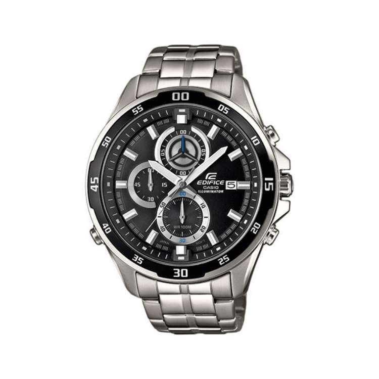 Este reloj analógico de la serie EDIFICE es el sueño del hombre moderno. Es robusto, fiable y satisface las expectativas más altas en cuanto a diseño y funcionalidad técnica. Su elegancia se define a través del contraste entre la carcasa de acero inoxidable y el color negro y plata de la pantalla, que se ilumina perfectamente en color a través de un botón.