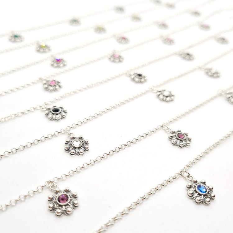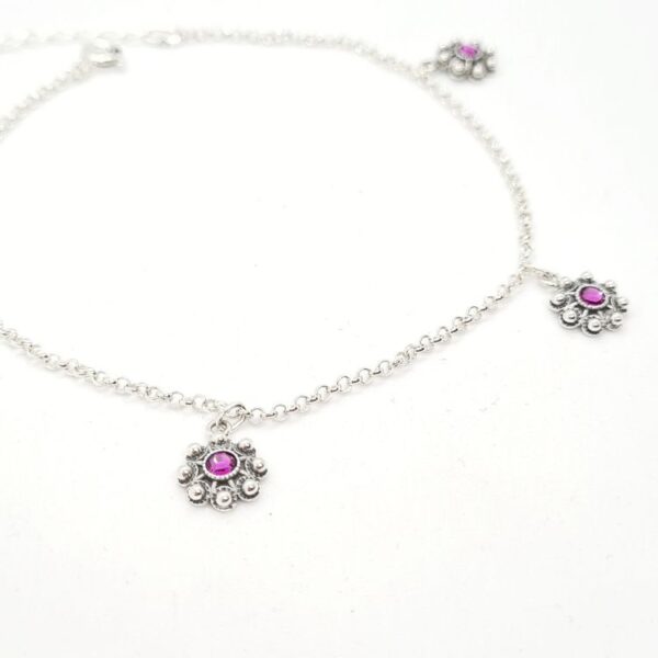 Tobillera charra en plata de ley con 4 botones charros y cristal de color.